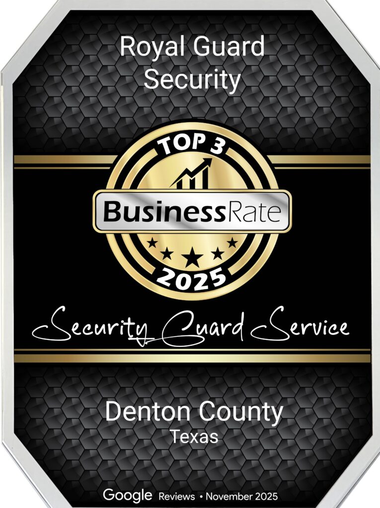 At Royal Guard Security, we understand that safety and peace of mind are priceless. That’s why we provide highly trained, licensed, and certified security guards for businesses, events, and residential communities across Denton County and North Texas. Whether you need coverage for a short-term assignment or a long-term partnership, our team is ready to protect what matters most. We are proud to have been recognized by Business Rate as one of the Top 3 Security Companies in Denton County (2025) a reflection of our dedication to excellence and client satisfaction.